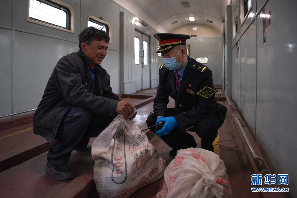 在5633次列車的“行李車廂”內(nèi),中國鐵路成都局集團(tuán)公司成都客運(yùn)段5633/5634次列車長劉偉(右)了解村民攜帶牲畜情況(4月11日攝)。新華社記者 胥冰潔 攝