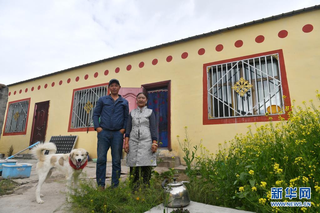 在青海省玉樹藏族自治州治多縣治渠鄉(xiāng)同卡村,村民昂文西讓和妻子布沙措江卓瑪站在易地搬遷的新家院子里合影(2019年9月12日攝)。