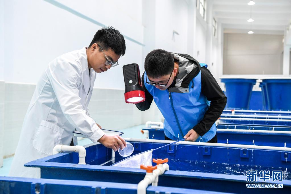 4月20日,大藤峽魚類增殖放流站的工作人員在魚苗孵化槽內(nèi)采樣。