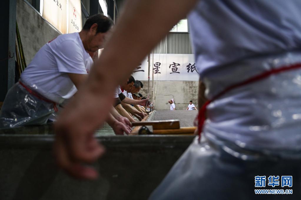 4月22日,在安徽宣城市涇縣“四丈宣紙”生產(chǎn)車間,工人在進行撈紙作業(yè)。