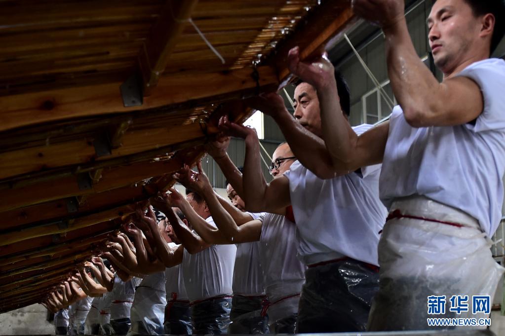 近日,在宣紙產(chǎn)地安徽省宣城市涇縣,“四丈宣紙”的抄制在一家紙業(yè)有限公司啟動(dòng)。50余名撈紙師傅操作巨型紙簾,齊心協(xié)力,在紙槽旁進(jìn)行撈紙作業(yè)。來(lái)回起落兩次,動(dòng)作整齊劃一。隨后工人們將紙簾吊起放至一邊揭下,一張巨大的宣紙便撈制成功。經(jīng)過(guò)曬、剪等工序后, 制成長(zhǎng)13.2米、寬3.6米的巨型宣紙就是“四丈宣紙”。