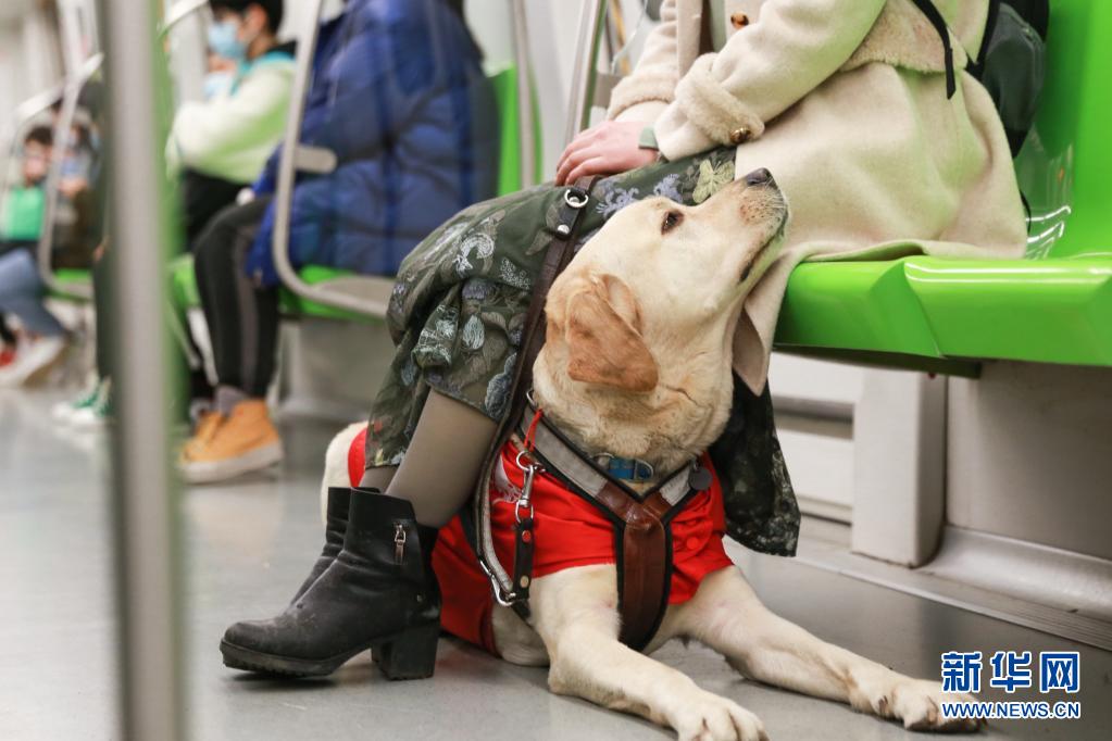 導(dǎo)盲犬“Bingo”陪伴李靜乘坐地鐵(3月27日攝)。 新華社發(fā) (張夢(mèng) 攝)