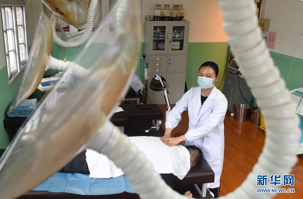 4月28日,葉景芬(前)在自己實(shí)習(xí)的龍泉市中醫(yī)院內(nèi)為患者做推拿。新華社記者 韓傳號(hào) 攝