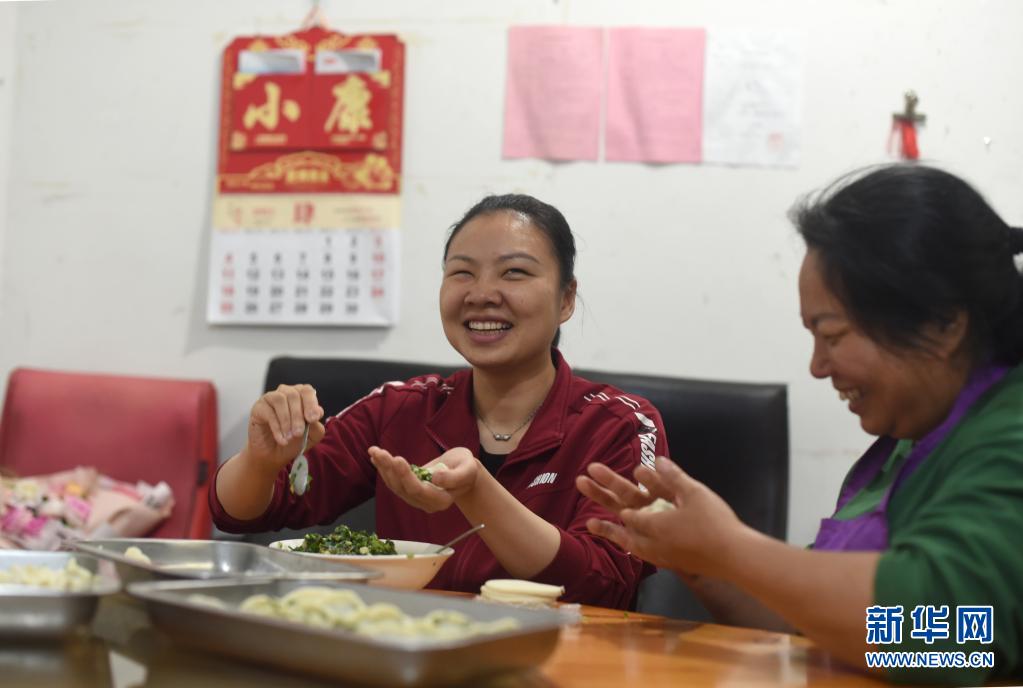 4月28日,葉景芬(左)和媽媽林鳳玉在家中包餃子。新華社記者 韓傳號 攝