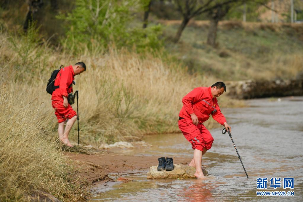 4月27日,巡線隊員張偉偉(右)、張浩軍巡線途中在河邊洗腳。新華社記者 張博文 攝