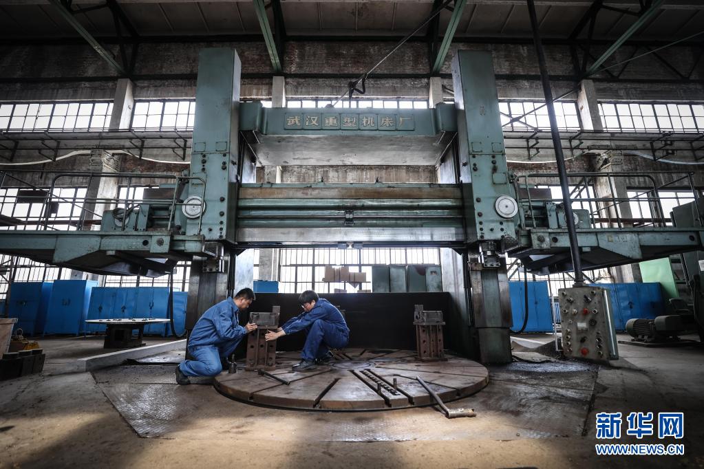 4月30日,王尚典(右)與同事對機床進行調整準備加工配件。