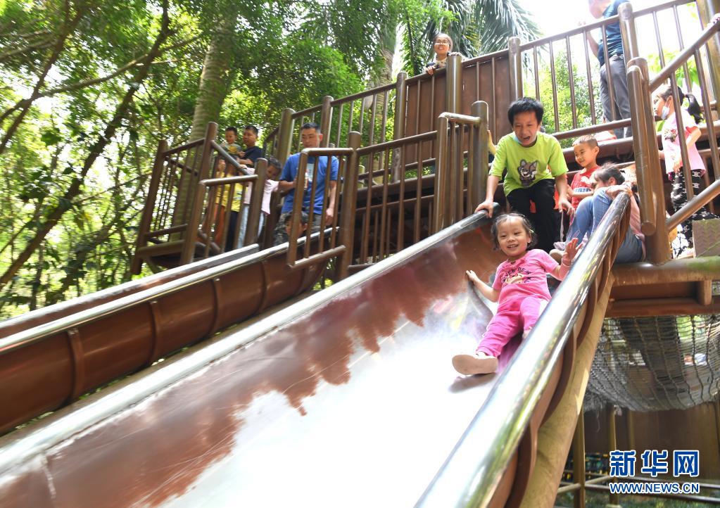 5月1日,孩子們?cè)趶V西南寧市青秀山風(fēng)景區(qū)陸地拓展競技樂園玩耍。
