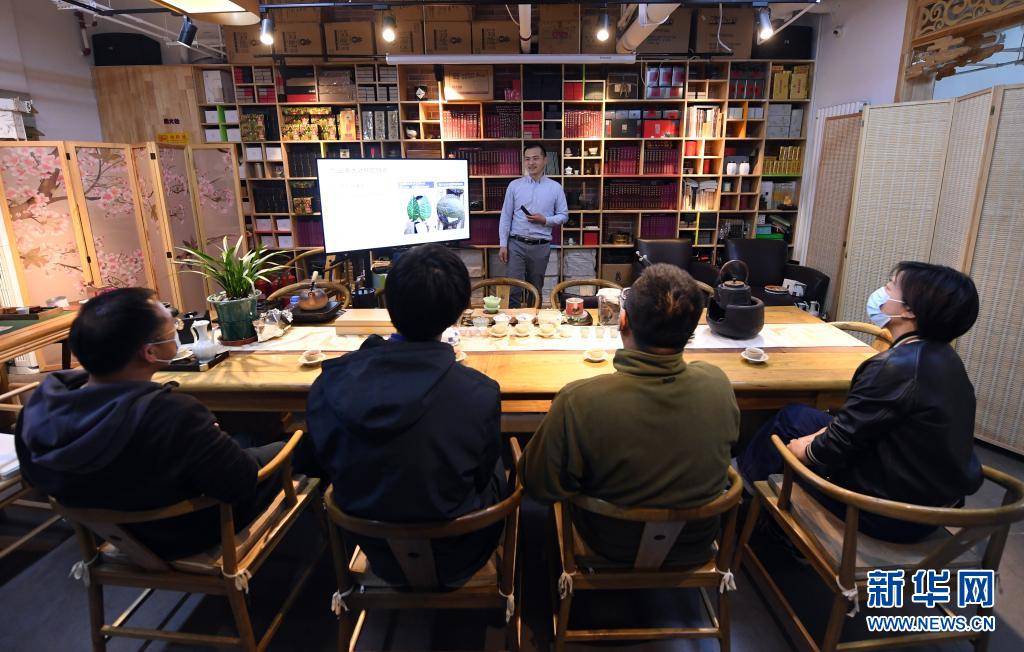 李卓澄(后)在“小茶館”中為客人介紹茶知識(4月29日攝)。新華社記者 任超 攝