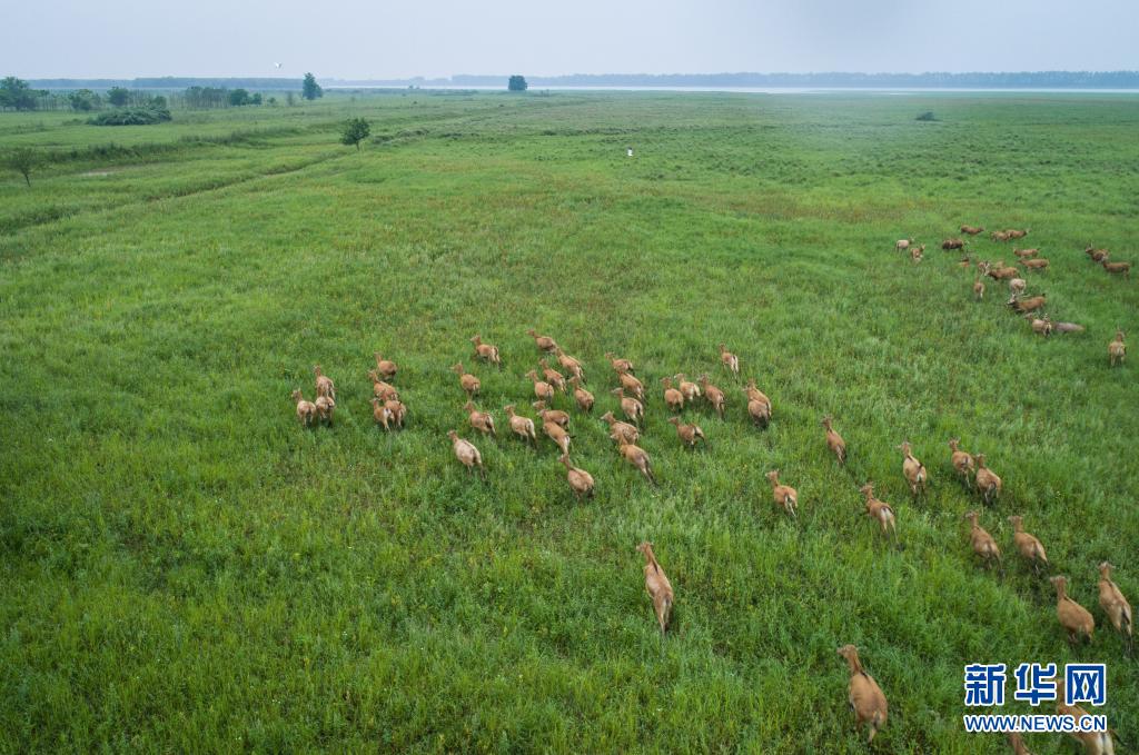 5月17日,一群麋鹿在石首麋鹿國家級(jí)自然保護(hù)區(qū)內(nèi)活動(dòng)(無人機(jī)照片)。新華社記者 肖藝九 攝