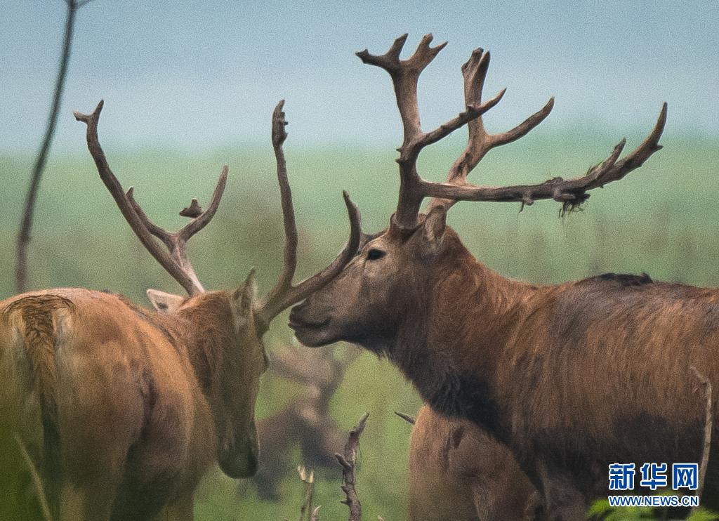 5月17日,麋鹿在石首麋鹿國家級自然保護(hù)區(qū)內(nèi)活動(dòng)。新華社記者 饒饒 攝