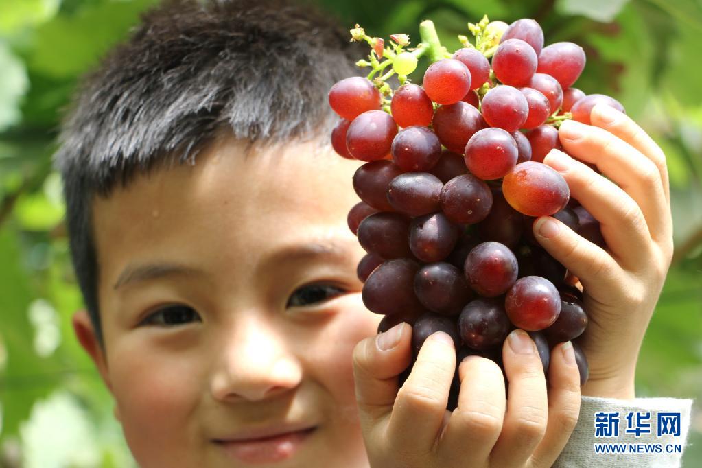 5月23日,在河北省平泉市道虎溝鄉(xiāng)雙峰社區(qū)一處設(shè)施葡萄大棚里,一名小朋友展示自己采摘的茉莉香葡萄。