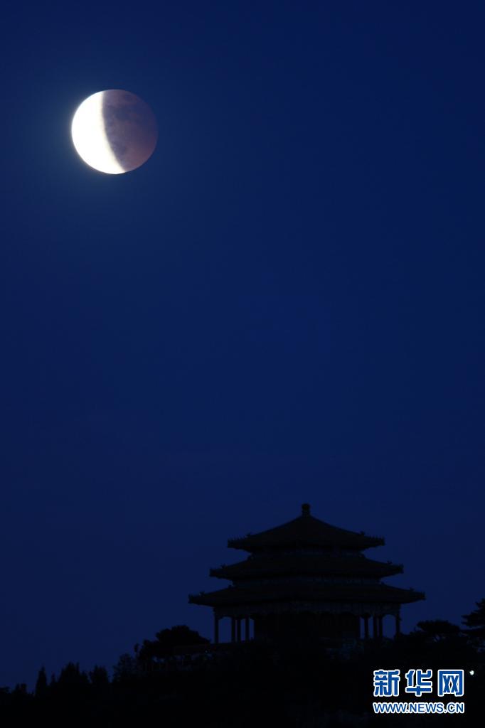 這是5月26日在北京拍攝的景山公園萬春亭和月食。