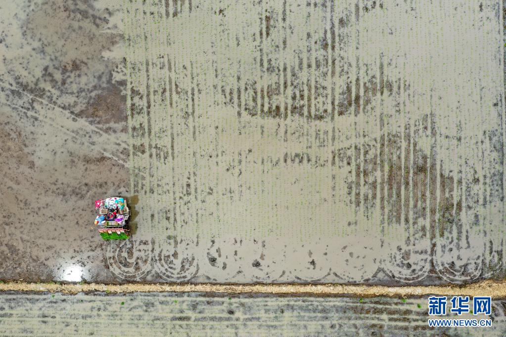 5月27日,在吉林省吉林市永吉縣一拉溪鎮(zhèn)九月豐家庭農(nóng)場(chǎng),農(nóng)民駕駛農(nóng)機(jī)進(jìn)行水稻插秧(無(wú)人機(jī)照片)。