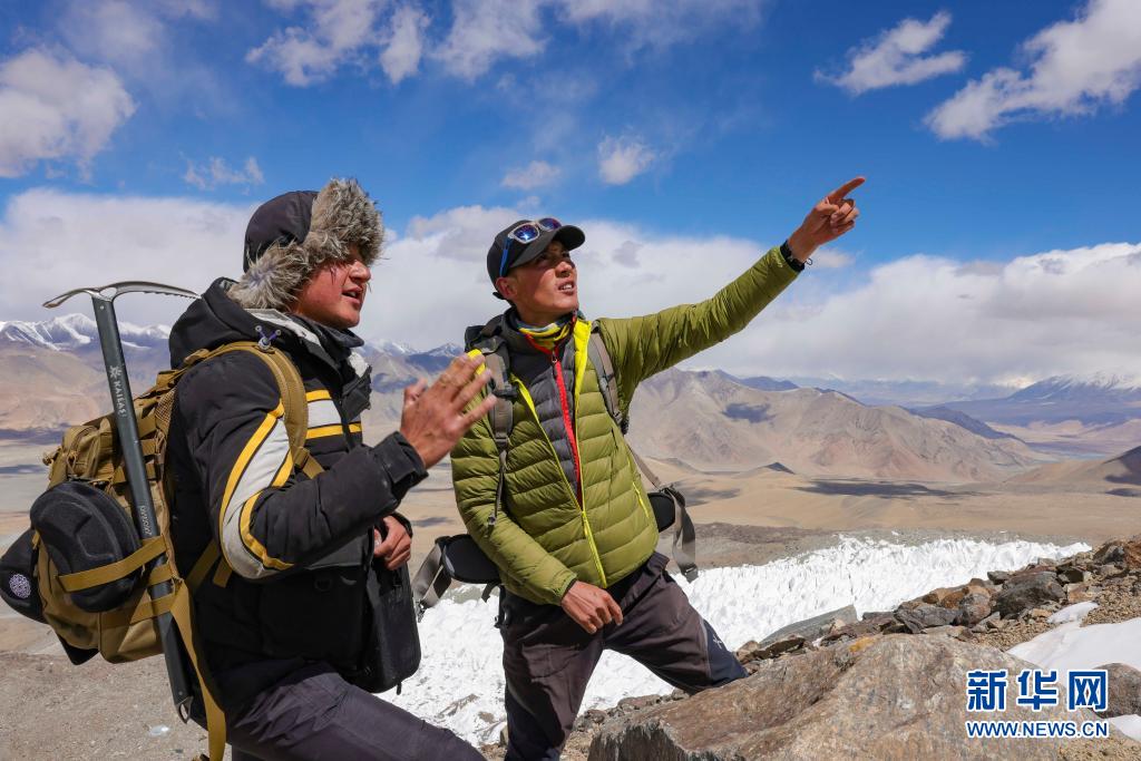 別克米爾扎·圖爾達(dá)力(左)和同伴庫爾班巴依·努爾麥麥提在討論登山前進(jìn)線路(5月15日攝)。新華社記者 胡虎虎 攝