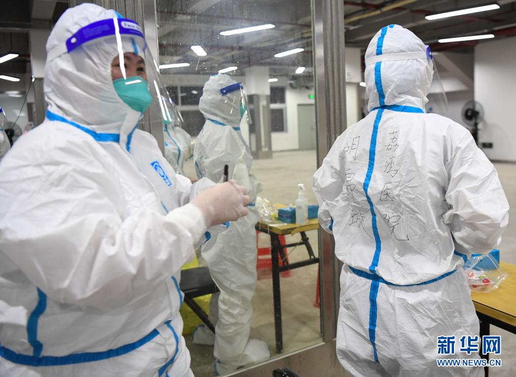 5月26日,在廣州荔灣體育館核酸檢測點(diǎn),荔灣中心醫(yī)院的醫(yī)務(wù)人員在防護(hù)服上寫上個人信息。新華社記者 鄧華 攝