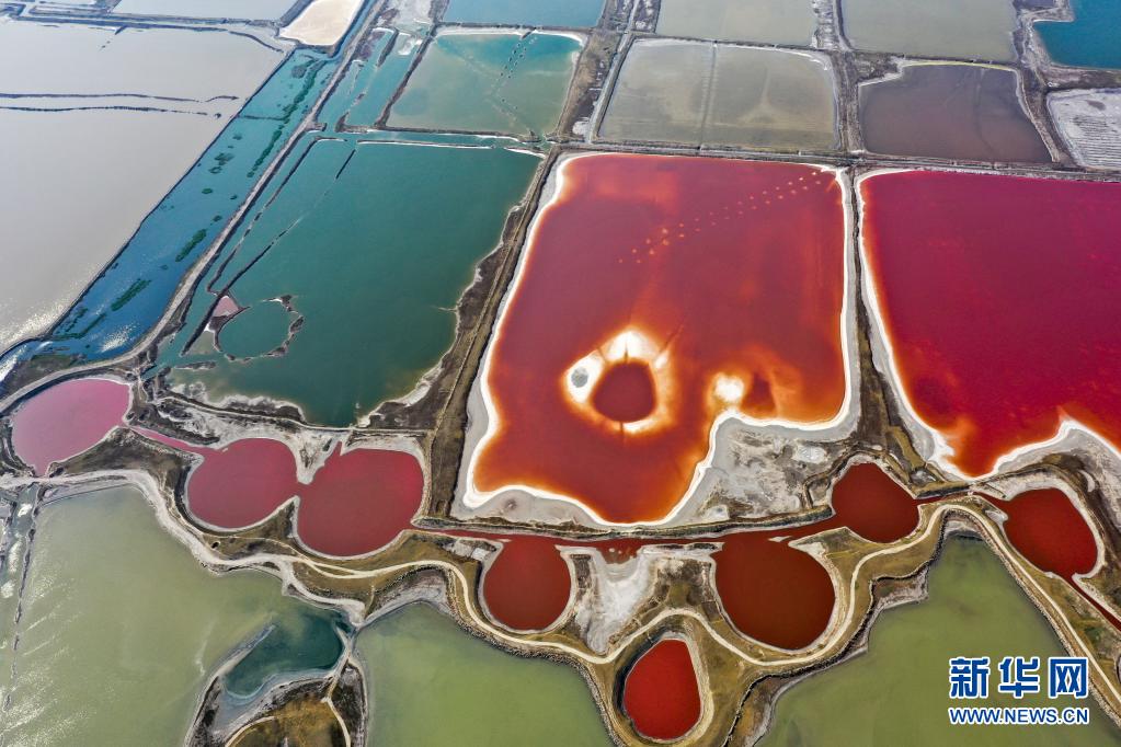 近日,隨著氣溫不斷升高,山西運(yùn)城鹽湖呈現(xiàn)五彩斑斕的景象。
