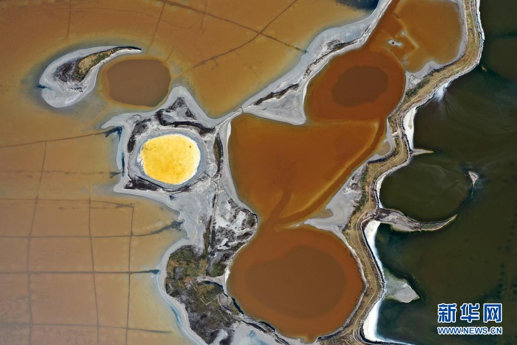 近日,隨著氣溫不斷升高,山西運城鹽湖呈現(xiàn)五彩斑斕的景象。