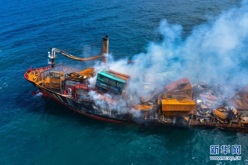 6月2日,斯里蘭卡總統(tǒng)戈塔巴雅下令將起火貨船“X-PRESS PEARL”號拖向遠離科倫坡港的深海區(qū),以防引發(fā)更大的環(huán)境災難。“X-PRESS PEARL”號貨船5月20日抵達科倫坡港西北約9.5海里錨地時發(fā)出火警求救信號。斯里蘭卡海洋環(huán)境保護局官員5月28日表示,在科倫坡港附近起火燃燒的“X-PRESS PEARL”號貨船預計將會引發(fā)嚴重環(huán)境災難。新華社發(fā)(斯里蘭卡空軍媒體處供圖)