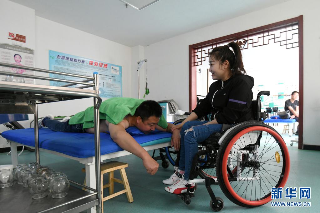 在山西省呂梁市石樓縣中醫(yī)醫(yī)院,關(guān)美(右)陪著周海云進(jìn)行康復(fù)訓(xùn)練(6月2日攝)。新華社發(fā)(劉亮亮攝)