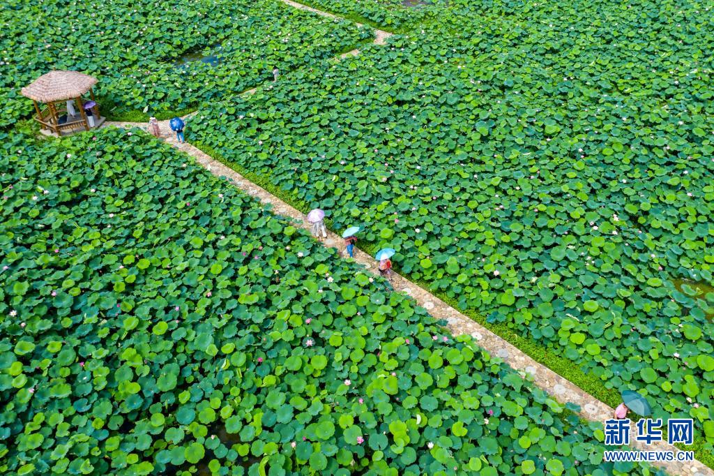 6月21日,在浙江省湖州市長興縣李家巷鎮(zhèn)石泉村歷史文化古村落,游客賞荷游玩(無人機照片)。