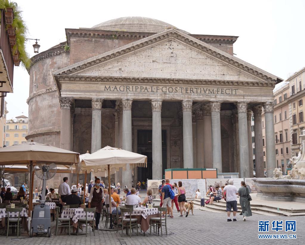 6月24日,人們在意大利羅馬萬神殿前一家餐館的戶外區(qū)域消費(fèi)。