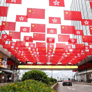 6月29日,在香港尖沙咀一條街上,中華人民共和國國旗和香港特別行政區(qū)區(qū)旗一起迎風(fēng)飄揚。