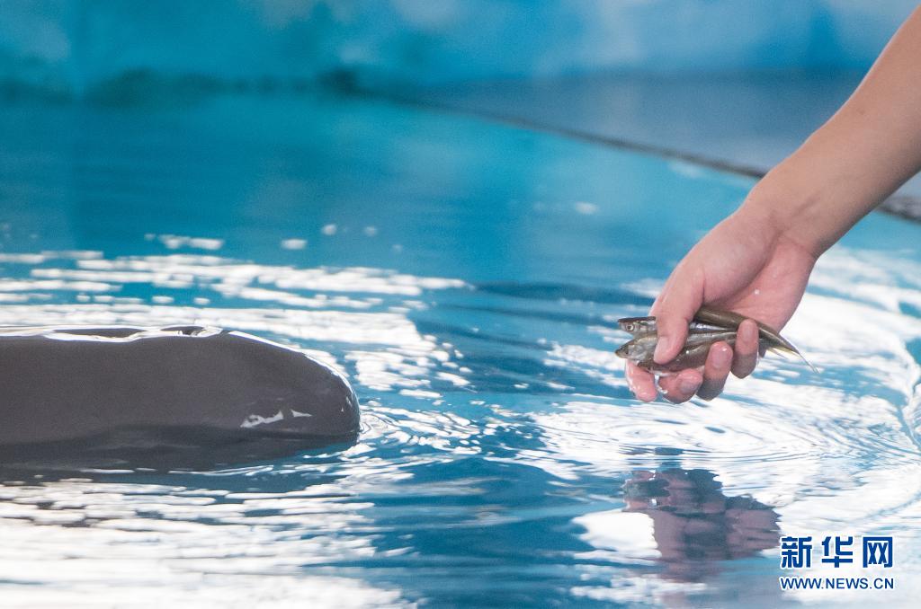 7月5日,中科院水生所白鱀豚館飼養(yǎng)員給長(zhǎng)江江豚喂食。新華社記者肖藝九攝