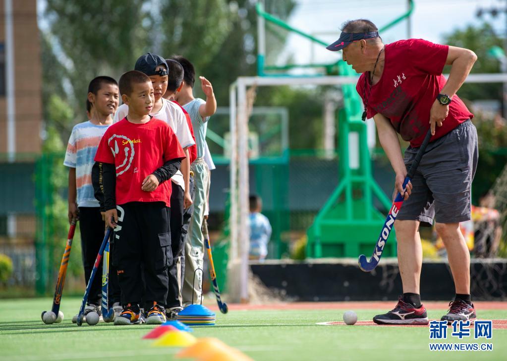 杜寶柱(右)帶領塔城市第二小學曲棍球隊的小隊員進行訓練(6月11日攝)。