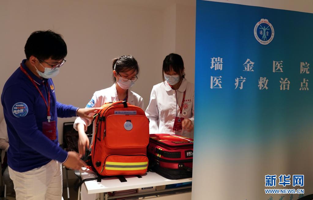 上海交通大學(xué)醫(yī)學(xué)院附屬瑞金醫(yī)院的醫(yī)護(hù)人員擔(dān)當(dāng)志愿者,在中共一大紀(jì)念館設(shè)立醫(yī)療救治點(diǎn),提供醫(yī)療保障任務(wù)(7月11日攝)。