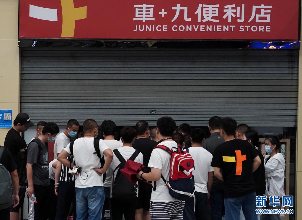 7月20日,滯留旅客在鄭州東站一家便利店外排隊(duì)購(gòu)物。