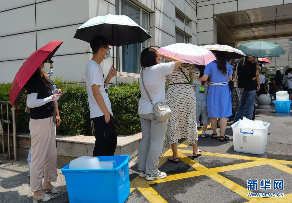 江蘇省南京市于7月21日開(kāi)始對(duì)全市常住人口、外來(lái)人員開(kāi)展全員核酸檢測(cè)。目前正值盛夏,氣溫較高,在南京市第一醫(yī)院河西院區(qū)核酸檢測(cè)點(diǎn),工作人員專門(mén)為排隊(duì)等候的市民準(zhǔn)備了冰塊降溫。