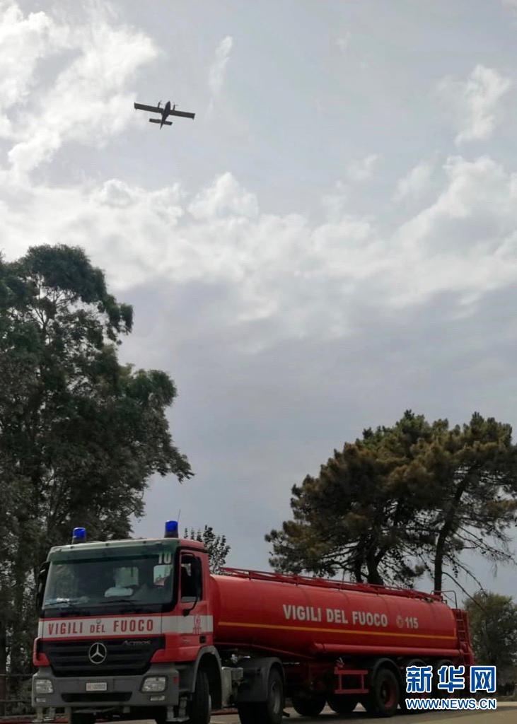 7月26日,消防車在意大利撒丁島參與滅火作業(yè)(手機(jī)照片)。