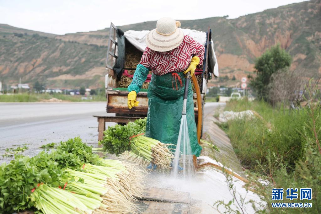 7月27日,甘肅省定西市安定區(qū)鳳翔鎮(zhèn)中川村村民在清洗芹菜。新華社發(fā)(王克賢 攝)