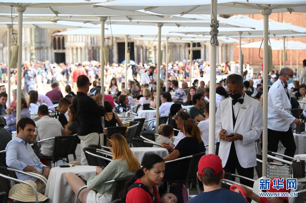 8月3日,游客在意大利威尼斯一處餐廳的戶(hù)外就餐區(qū)消費(fèi)。