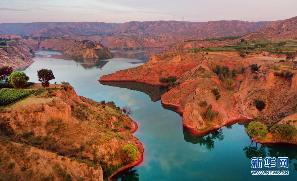 8月6日,朝霞映照下的靖邊縣龍洲鎮(zhèn)波浪谷丹霞景區(qū)(無人機(jī)照片)。