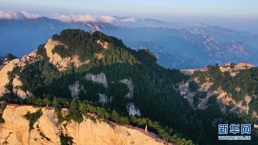 晨曦初露,位于陜西省渭南市的華山景區(qū)沐浴在霞光之中,景色壯美。
