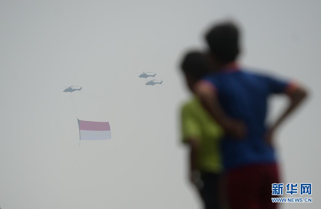 8月17日,人們注視著懸掛印度尼西亞國旗的直升機飛過雅加達上空。8月17日是印度尼西亞獨立日。新華社發(fā)(祖卡南攝)