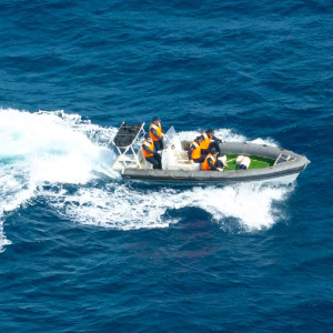 11月14日上午,黄岩舰海警执法员在中国南海黄岩岛海域驾驶小艇执行任务(无人机照片)。