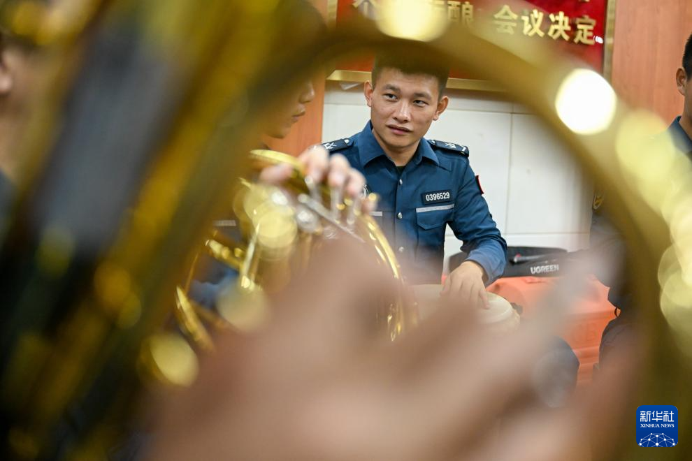 12月3日晚餐后,在巡航值守于中国南海黄岩岛海域的黄岩舰上,海警执法员们在会议室进行乐队排练。