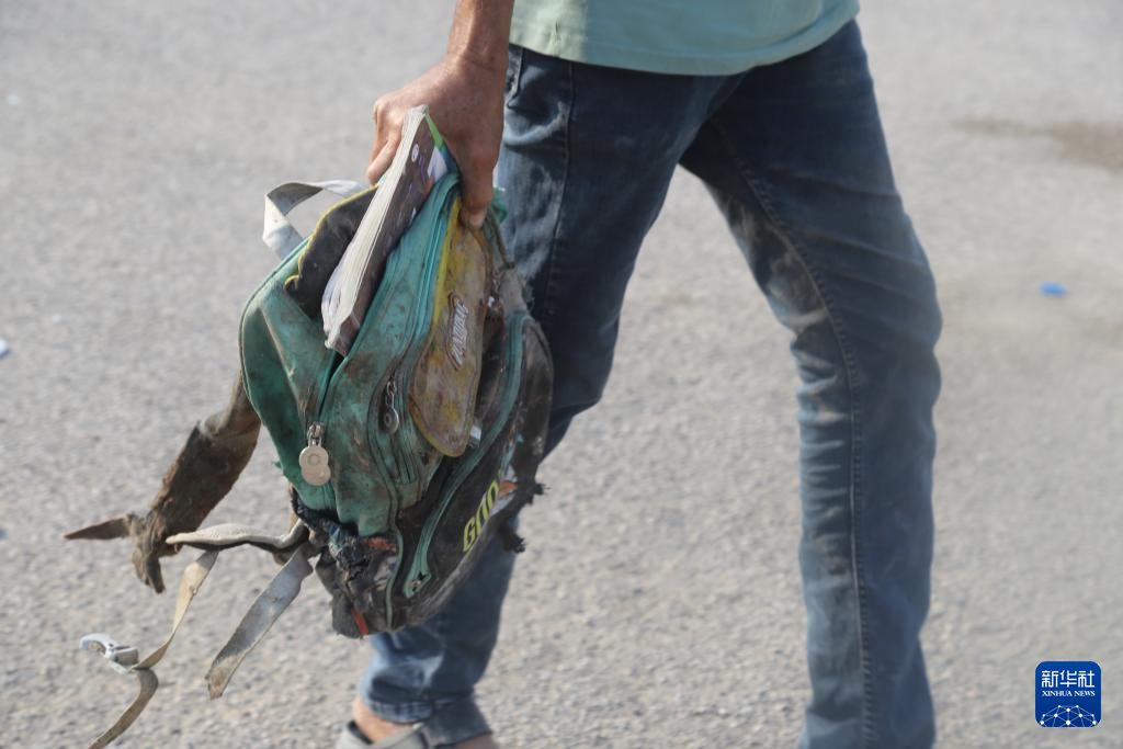 2月28日,在伊朗南部米纳卜市一所被袭击的小学,一名男子手持从废墟中翻出的书包。