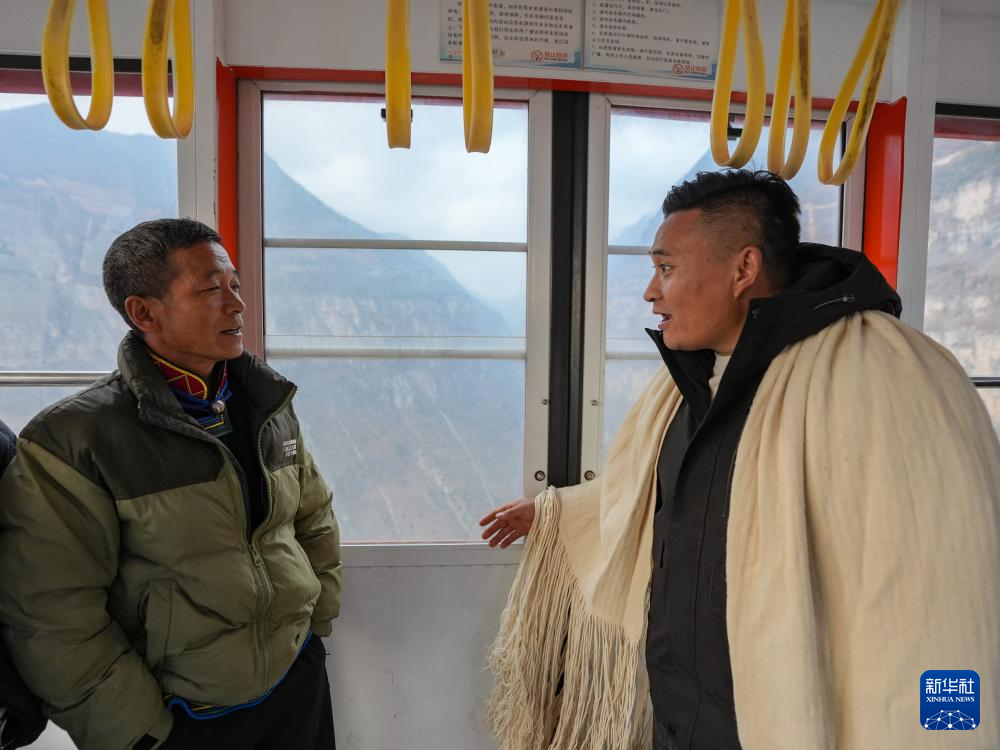 1月28日,郑望春在古路村索道车厢内和外出务工返乡的村民交流。