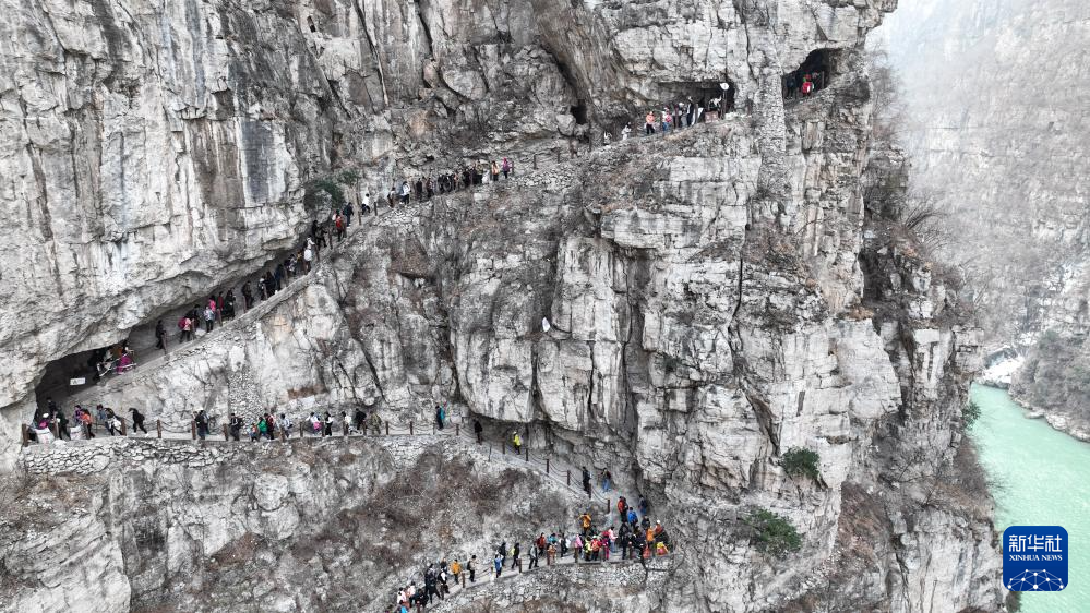 游客在四川省汉源县永利彝族乡古路村体验骡马道徒步(无人机照片,2024年3月16日摄)。