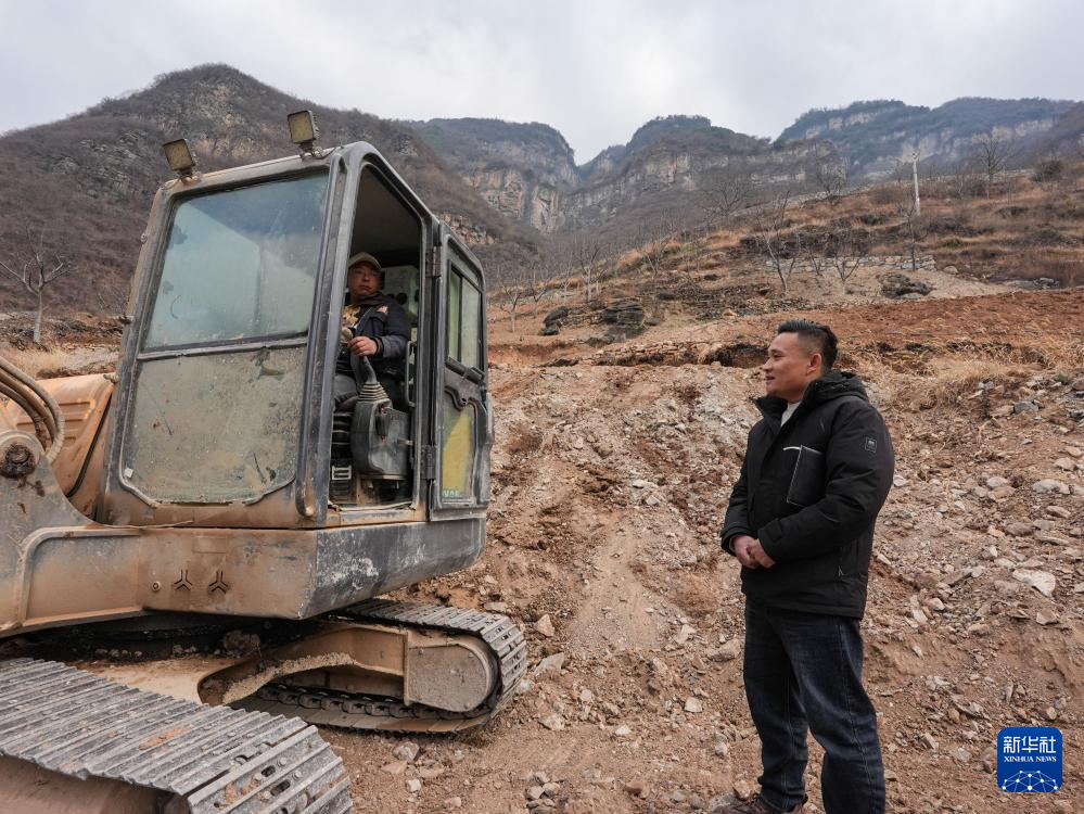 1月29日,郑望春(右)向村民李金勇了解村道建设施工情况。