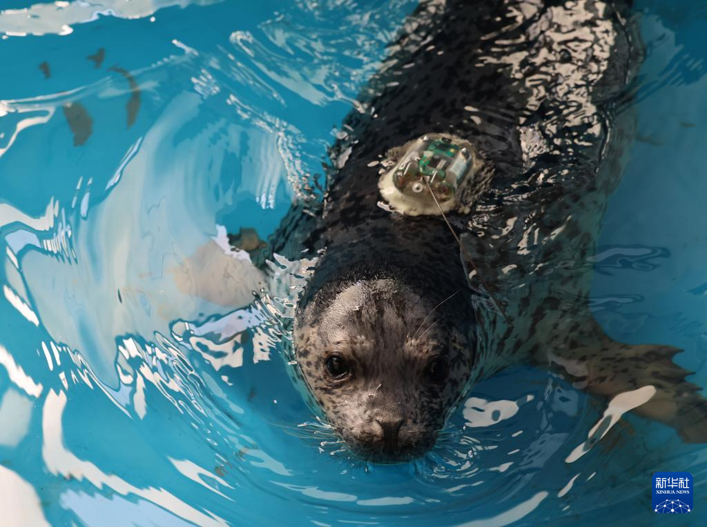4月15日,辽宁省农业科学院所属辽宁省海洋水产科学研究院的一处水池中,一头待放归的斑海豹在水中游动,它的背部粘贴着用于监测和追踪的信标。