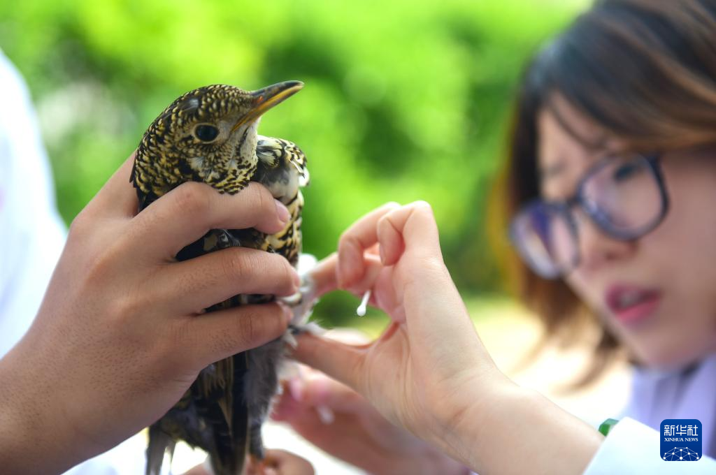 4月19日,沧州市野生动物救护中心工作人员为获救的国家二级保护动物虎斑地鸫进行体检。