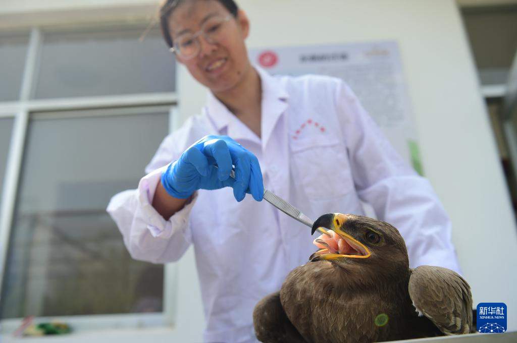 4月19日,沧州市野生动物救护中心工作人员为获救的国家一级保护动物乌雕喂食。