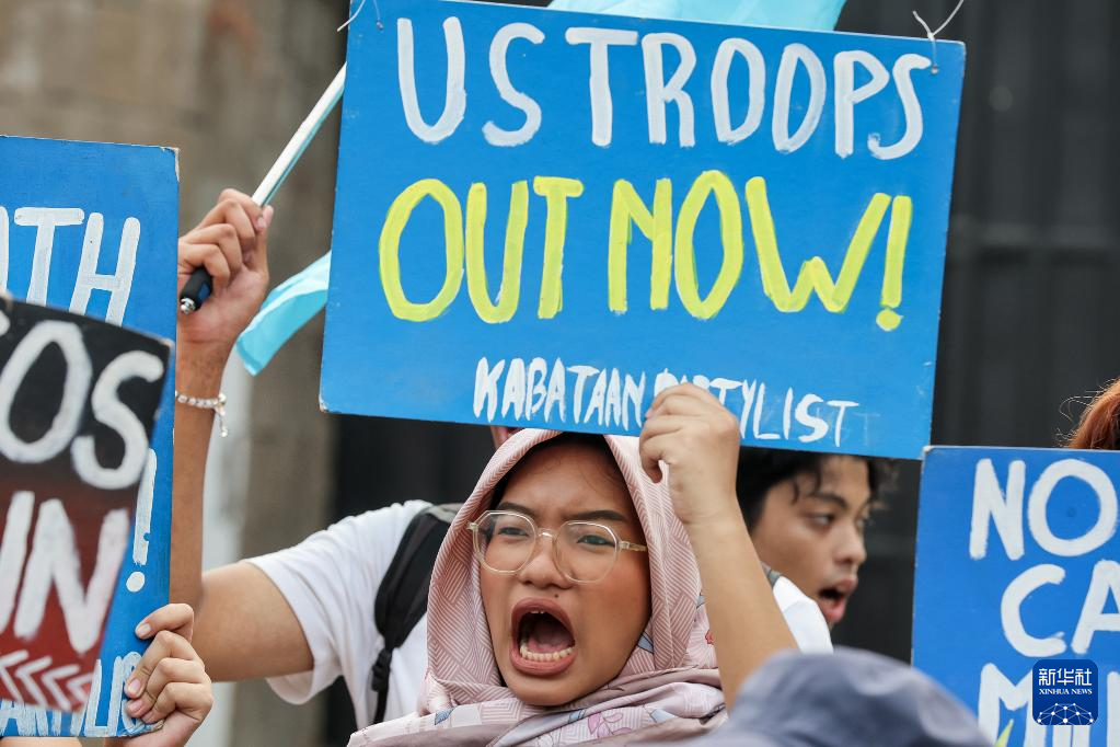 菲律宾和美国“肩并肩”联合军事演习20日在菲首都马尼拉启动。菲律宾民众当天在菲武装部队总部外集会,抗议菲美举行联合军演。