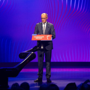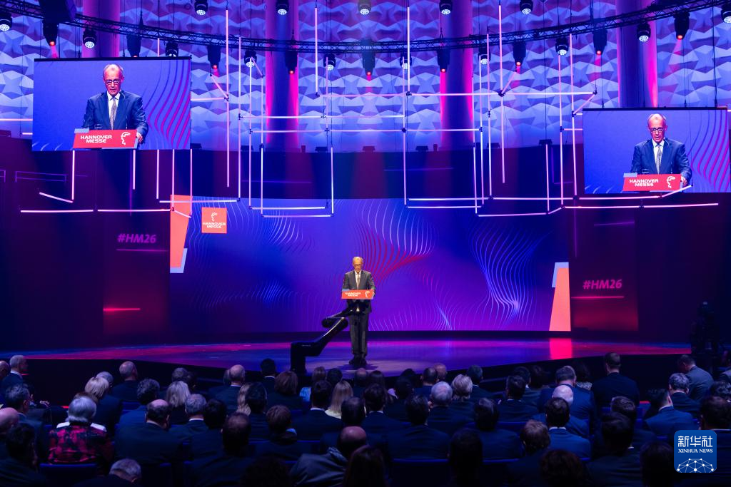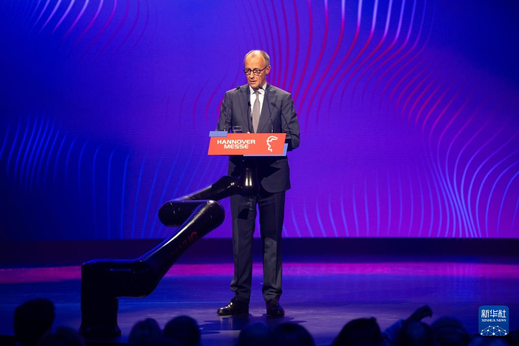 4月19日,德国总理默茨在汉诺威工业博览会开幕式上致辞。