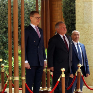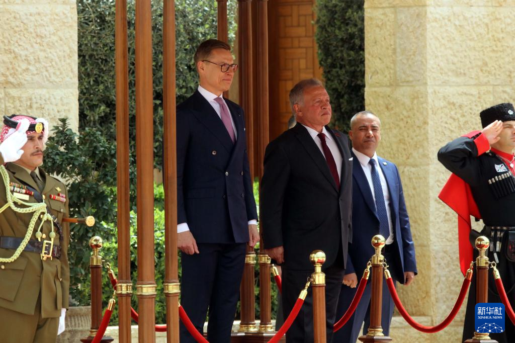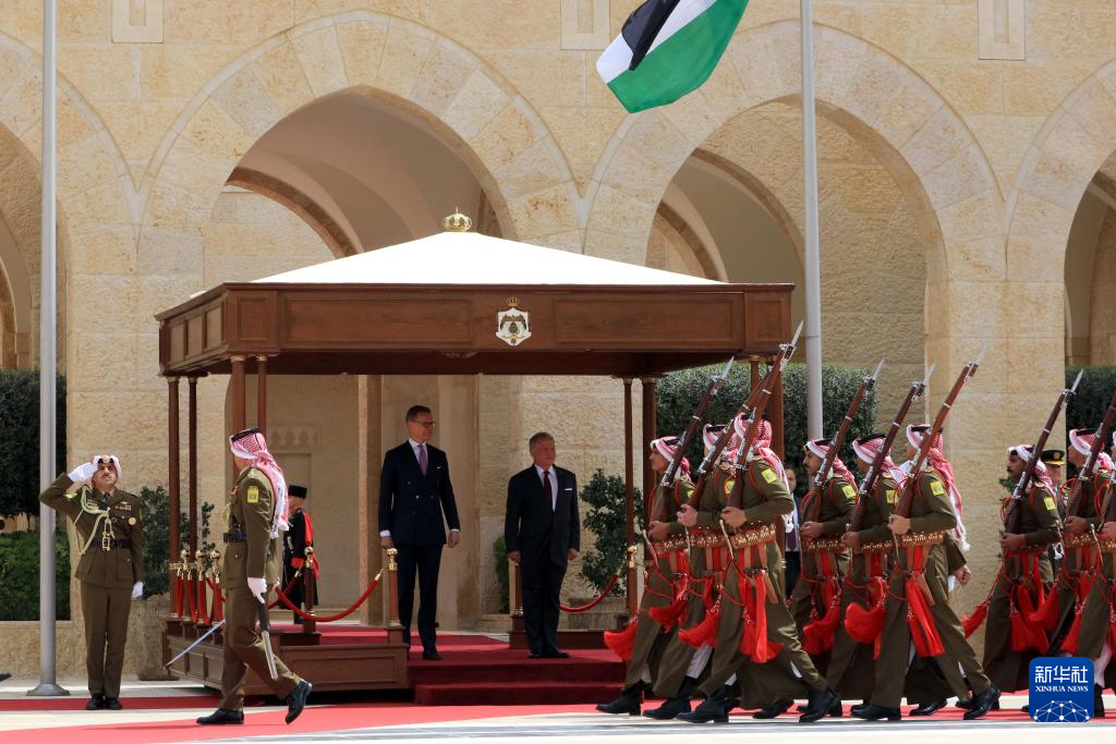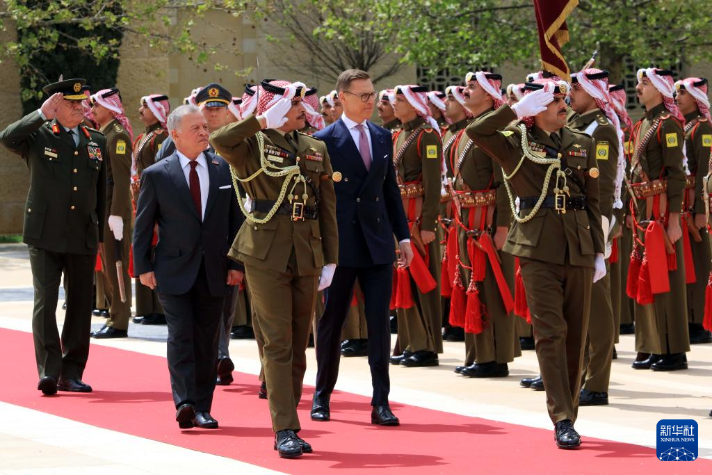 4月19日,约旦国王阿卜杜拉二世(中右)在首都安曼为到访的芬兰总统斯图布(中左)举行欢迎仪式。