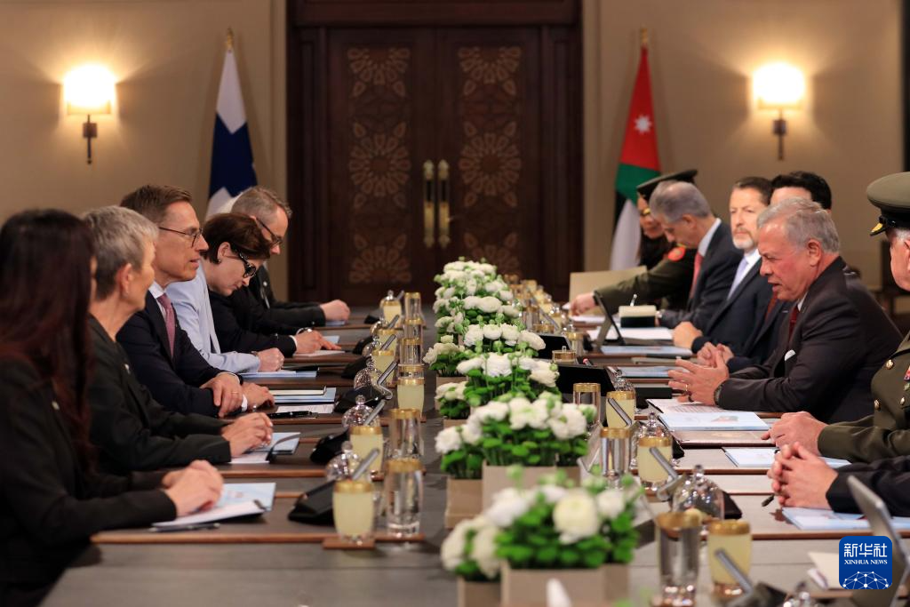 4月19日,在约旦首都安曼,约旦国王阿卜杜拉二世(右二)与到访的芬兰总统斯图布(左三)举行会谈。